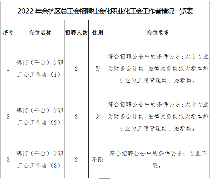 本次招聘專職工會工作者6名,由余杭區總工會統一調配至相關鎮街(平臺)工作。